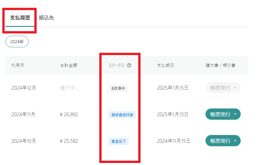 (3)上記を実施しても支払履歴のステータスが「請求書送付済」になっている場合は「4.支払いを行った曜日は土日祝日ではないか」を確認してください。