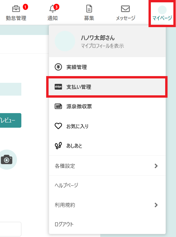 (1)ハノワにログインし、マイページ>支払い管理>支払履歴 にアクセスします。