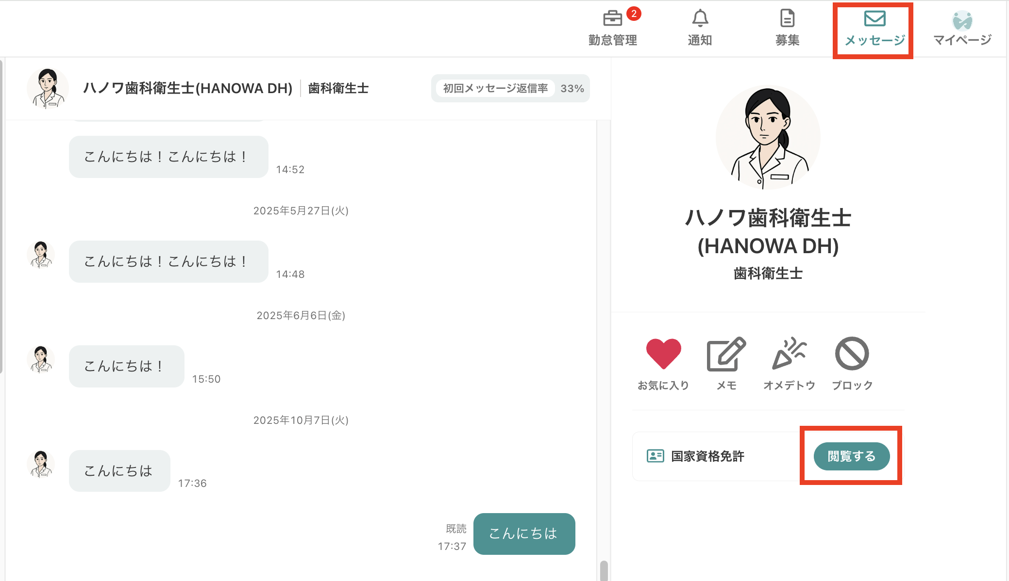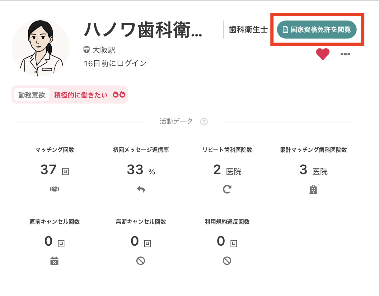 勤務確定後、パートナーのプロフィールもしくはメッセージより国家資格免許をダウンロードできます。