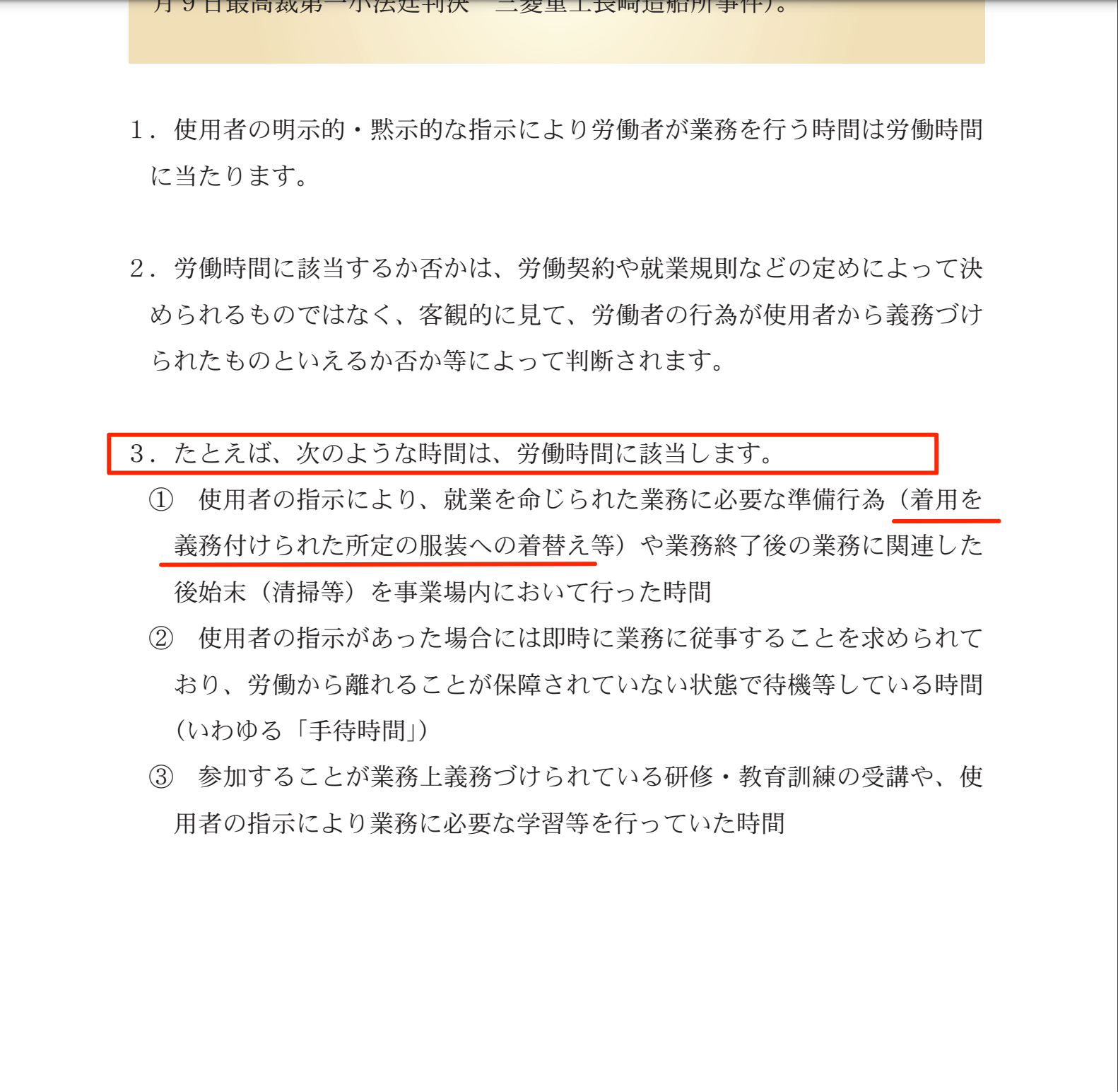 はい、含まれます。厚生労働省のガイドライン(「労働時間の適正な把握のために使用者が講ずべき措置に関するガイドライン」)では、「業務に必要な準備行為(着替えなど含む)は勤務時間に該当する」と明記されており、ハノワではこのガイドラインを基準としております。