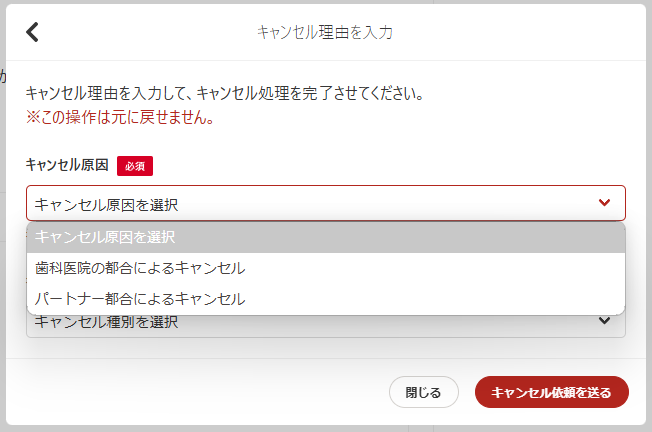どちらの都合によるキャンセルかを選択する項目です。[歯科医院の都合によるキャンセル]か[パートナー都合によるキャンセル]を選択します。