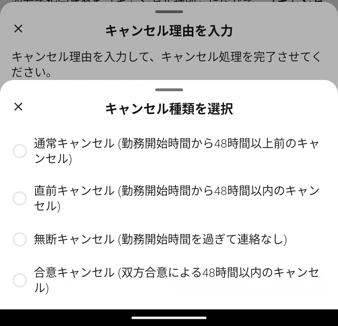 勤務開始時間を基準に、どのタイミングによるキャンセル申請かを選択する項目です。ペナルティの程度と紐付きます。