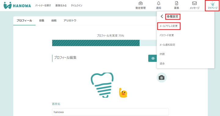 [マイページ]→[各種設定]→[メールアドレス変更]から変更してください。