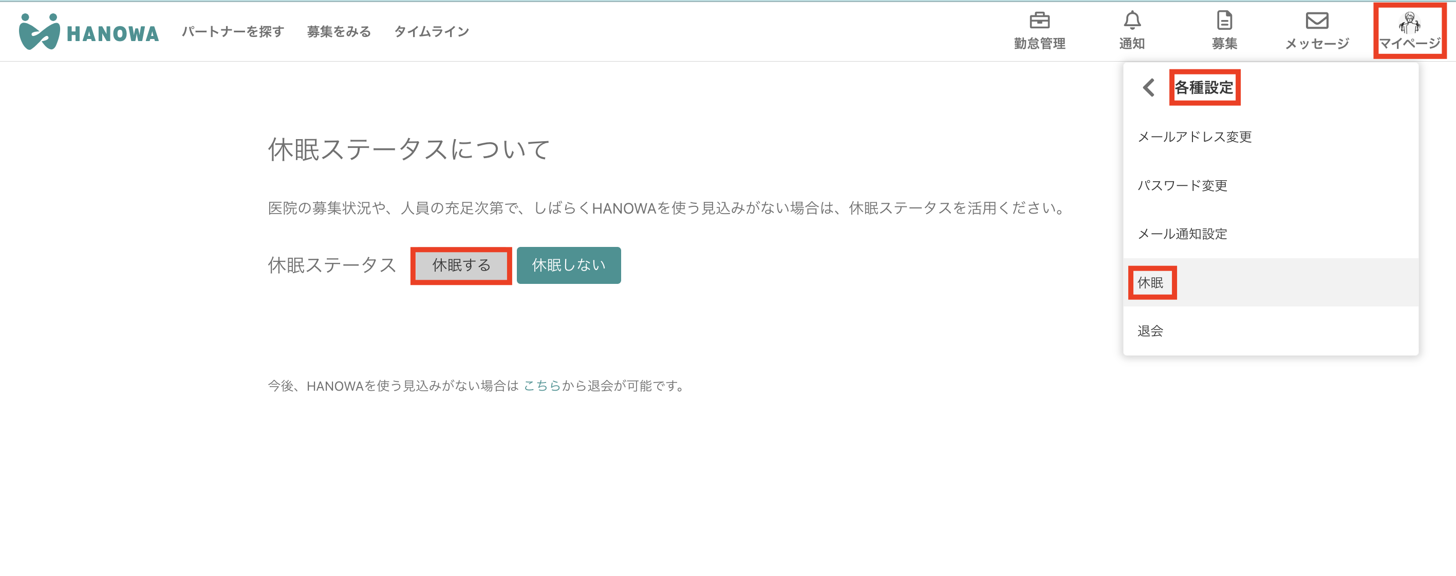 医院の募集状況や、人員の充足次第で、しばらくハノワを使う見込みがない場合は、休眠ステータスを活用ください。