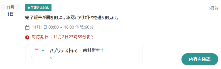 ※確認方法:勤怠管理 > 確定ページにて「完了報告未承認」であること