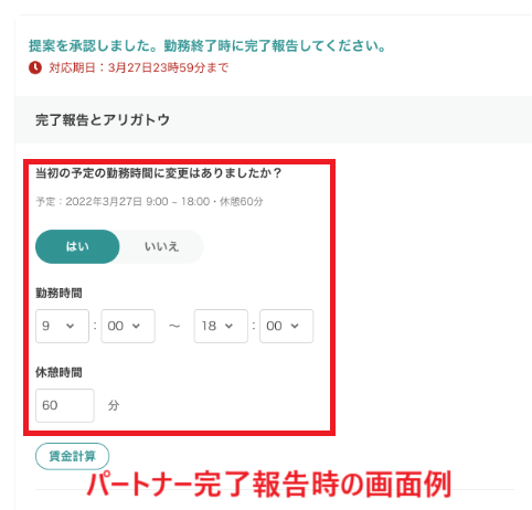 はい、可能です。勤務後の完了報告時に勤務時間が変更できます。そのため、勤務前の事前申請時に内容に相違があった場合や、突発的に勤務時間が延長となった場合でも問題はありません。※パートナー側では、完了報告画面の該当箇所にて勤務時間の修正が可能です。