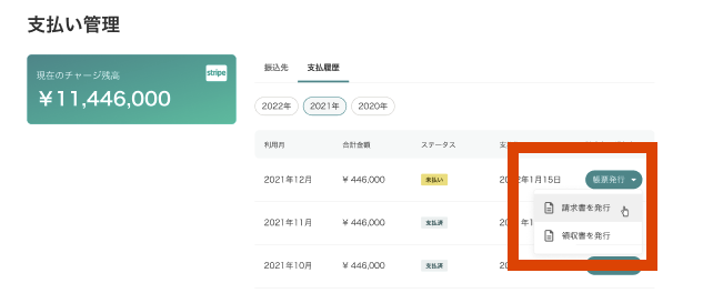 マイページ > 支払管理 より過去に発行した請求書および領収書がダウンロードできます。