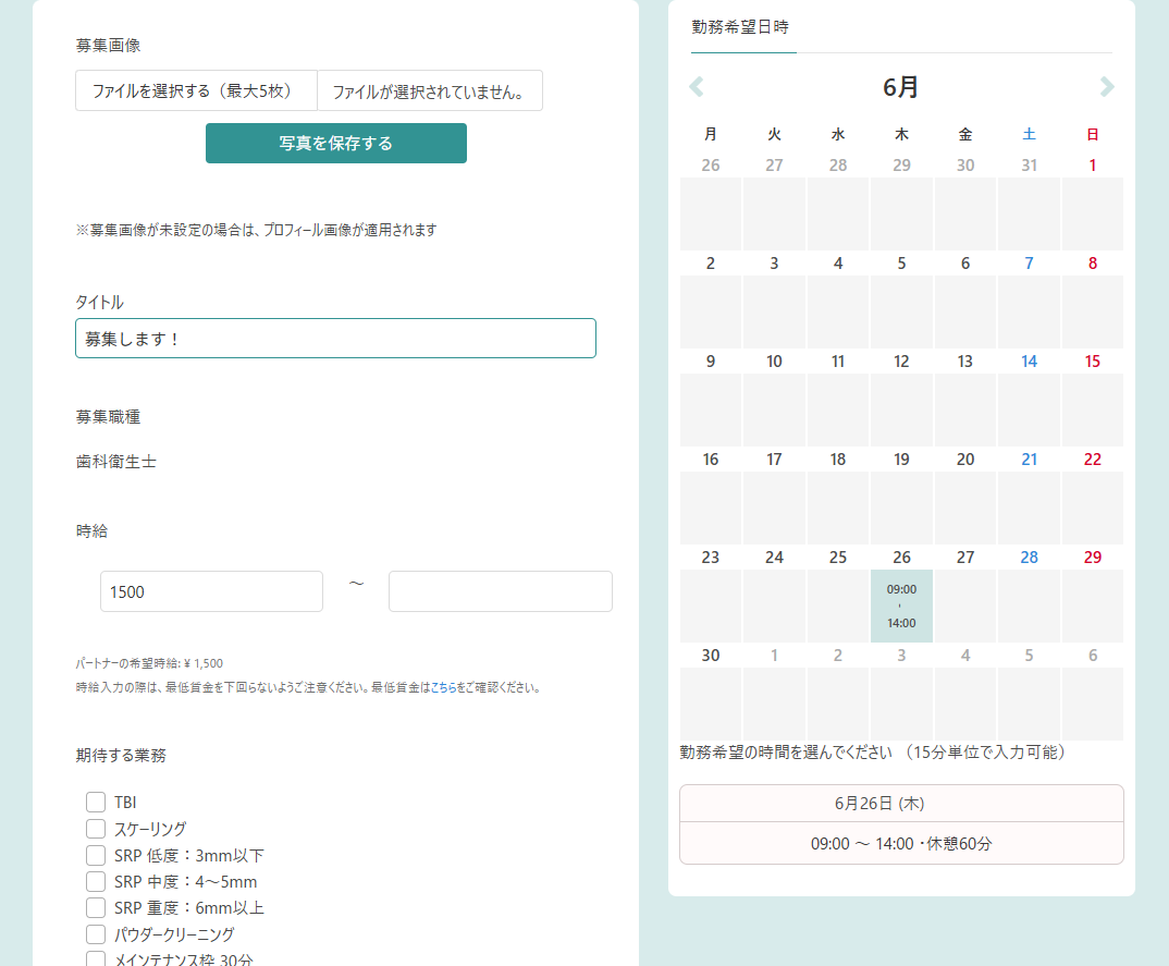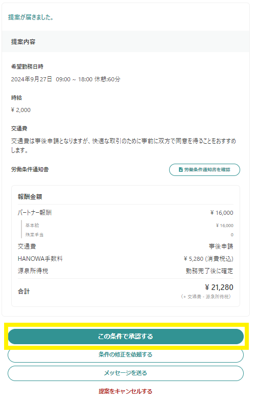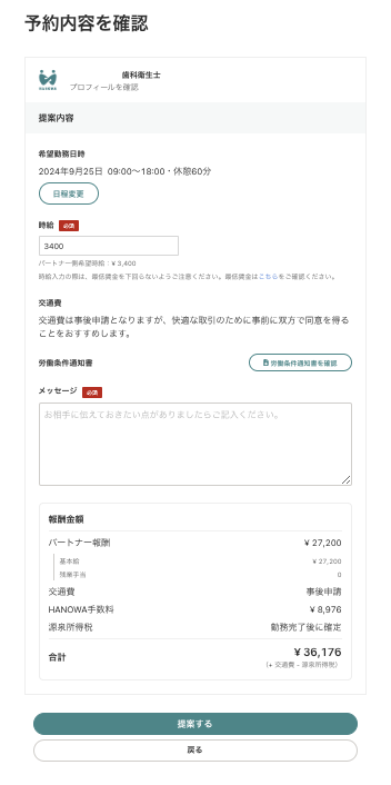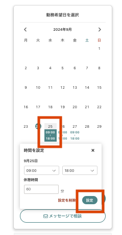 メッセージにて勤務合意が取れたら、勤務日前に正式依頼(事前予約)を行います。