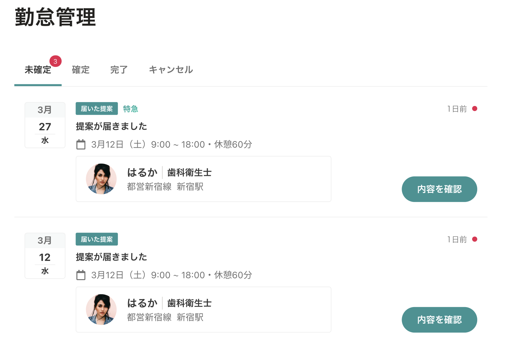 勤務前に、双方での申請・承認をもって勤務確定となります。