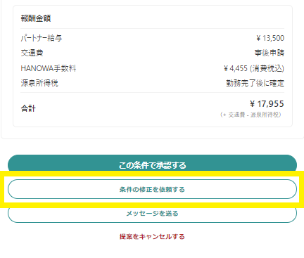 届いた正式依頼の「条件の修正を依頼する」をクリック。