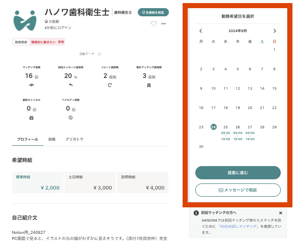 ②募集カレンダーに登録している時間が含まれた案件を提案している